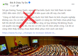 Mới đây, ông Dương Trung Quốc đầu bạc được RFA rất tín nhiệm và hôm qua trong một cuộc phỏng vấn của RFA, ông ta nói rằng: “Cũng có thể nói một cái yếu của Quốc hội Việt Nam là tính chuyên nghiệp không cao. Do cơ chế tổ chức, có người có năng lực thể hiện chưa phát huy hết thì đã hết nhiệm kỳ. Có ra tiếp tục ứng cử hay không thì không thuộc cái quyền của đại biểu đó, mà do cơ chế của tổ chức phân công. Cái đó ai cũng nhìn thấy nhưng chưa được khắc phục một cách căn bản.”.