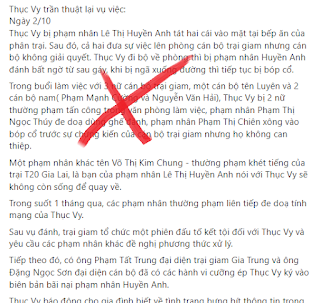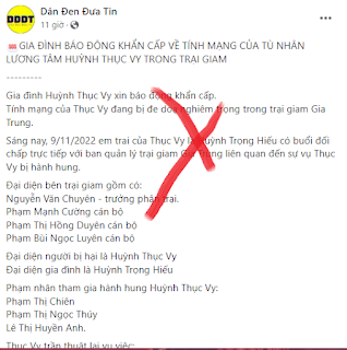 Sáng nay trang phản động có tên “Dân Đen Đưa Tin” loan báo khẩn cấp về “Tính mạng của tù nhân lương tâm Huỳnh Thục Vy trong trại giam”. Theo đó, Huỳnh Thục Vy bị bạn tù đánh và có lần đánh trước mặt cán bộ trại giam.Theo lời kể của Huỳnh Thục Vy thì cô ta bị 2 nữ phạm nhân khác đánh, và bị các phạm nhân khác đe dọa tính mạng. Ngoài ra, Vy thường xuyên bị các phạm nhân khác đấu tố, cô lập.