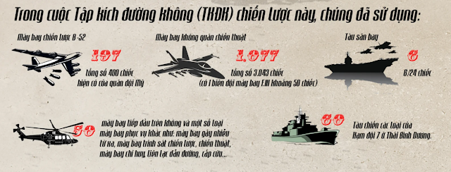 Trong cuộc Tập kích đường không (TKĐK) chiến lược này, chúng đã sử dụng máy bay chiến lược B-52: 197/tổng số 400 chiếc hiện có của quân đội Mỹ; máy bay không quân chiến thuật: 1.077/tổng số 3.043 chiếc (có 1 biên đội máy bay F.111 khoảng 50 chiếc); tàu sân bay: 6/24 chiếc; hơn 50 máy bay tiếp dầu trên không và một số loại máy bay phục vụ khác như: máy bay gây nhiễu từ xa, máy bay trinh sát chiến lược, chiến thuật, máy bay chỉ huy, liên lạc dẫn đường, cấp cứu cùng 60 tàu chiến các loại của Hạm đội 7 ở Thái Bình Dương.