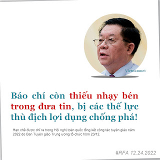 Cách đây vài hôm, RFA có bài viết trong đó dẫn lại ý kiến chỉ đạo Hội nghị báo chí toàn quốc (tổ chức tại TP HCM hôm 24/12/2022) của Trưởng ban Tuyên giáo Trung ương Nguyễn Trọng Nghĩa. Theo đó, RFA dẫn lời ông Nghĩa chê trách báo chí Nhà nước “còn thiếu nhạy bén trong đưa tin, thậm chí đưa tin gây hiểu nhầm, hoang mang trong dư luận; bị các thế lực thù địch lợi dụng chống phá” và “việc nắm bắt, định hướng chính trị, tư tưởng, chỉ đạo giải quyết một số vấn đề dư luận quan tâm, nhất là phòng, chống dịch bệnh, quản lý tài nguyên môi trường, khoa học công nghệ, giáo dục, lao động việc làm còn hạn chế”…
