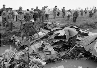 Chiếc máy bay B-52 đầu tiên bị Tiểu đoàn 59, Trung đoàn Tên lửa 261 bắn rơi trên cánh đồng Chuôm, xã Phù Lỗ, huyện Đông Anh vào 20h13″ ngày 18-12-1972. Ảnh: TTXVN