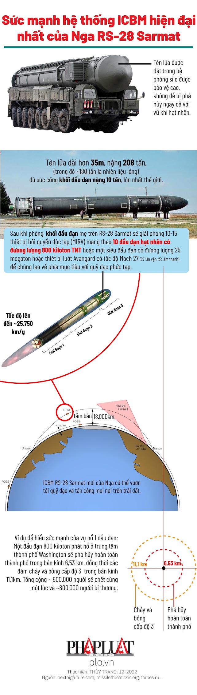 Tổng thống Nga Vladimir Putin ngày 21-12 xác nhận các đơn vị chiến đấu sẽ sớm được bàn giao thêm thiết bị lướt siêu vượt âm Avangard và tên lửa đạn đạo liên lục địa (ICBM) mang đầu đạn hạt nhân RS-28 Sarmat – hệ thống ICBM hiện đại nhất của Nga. Cùng PLO điểm qua sức mạnh hệ thống ICBM RS-28 Sarmat này qua infographic dưới đây.