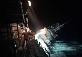 Tàu HTMS Sukhothai nghiên hẳn về một bên khi nước tràn vào trong tàu do sóng lớn. (Ảnh: Hải quân Thái Lan)