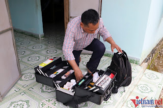 Thay vội bộ quần áo, kiểm tra vali xếp đầy ắp các loại thuốc và chiếc túi chứa dụng cụ y tế ông Phi lên chiếc xe Dream cũ, phóng đi.