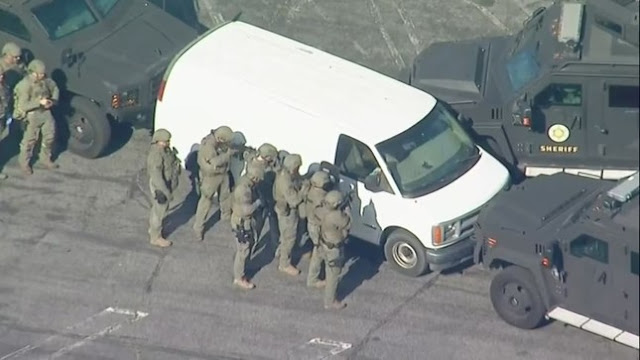 Cảnh sát tiếp cận xe tải trắng mà sau đó họ phát hiện thi thể tay súng Huu Can Tran đã sát hại 10 người, làm bị thương 10 người khác. Ảnh: ABC News.