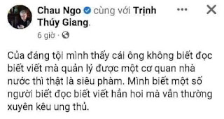 Trên FB, khi tham gia bình luận vụ việc này với Fb Trịnh Thúy Giang, anh Châu đã viết: “Của đáng tội mình thấy cái ông biết đọc biết viết mà quản lý được một cơ quan nhà nước thì thật là siêu phàm. Mình biết một số người biết đọc biết viết hẳn hoi mà vẫn thường xuyên kêu ung thủ”.