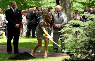 Người phụ nữ đang thực hiện nghi thức trồng cây trong hình là Kate. Cô là vợ của Hoàng tử William trồng cây tại Rideau Hall, Ottawa, Canada.