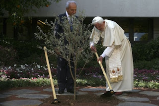Hãy nhìn, người trong hình là Giáo hoàng Pope Benedict XVI. Nhiếp ảnh gia đã chớp được hình ảnh ông đang trồng cây Oliu ở với Tổng thống Israel Shimon Peres tại dinh thự ở Jerusalem.