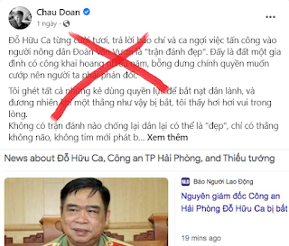 Ảnh chụp màn hình Fb của Đoàn Bảo Châu. Đây là minh chứng rõ nhất về chuyện mượn vụ Đỗ Hữu Ca bị bắt để xới lại vụ Đoàn Văn Vươn với những lập luận ngụy biện.