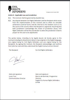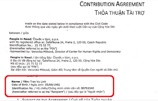 Dưới đây là một Hợp đồng tài trợ của một NGO ở Séc cho Trần Vũ Linh để tổ chức khóa đào tạo chính trị nền tảng bằng phương pháp online không đồng bộ tại Manila, Philippines. Bạn đọc có thể bấm vào đây [CA.pdf] để đọc toàn văn bằng cả tiếng Anh và tiếng Việt.