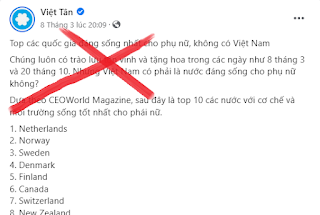 Liên tiếp trong hai ngày, 8/3 và 9/3/2023, tổ chức khủng bố Việt Tân đăng bài viết của tay Trọng Nhân Nguyễn nào đó, dựa trên số liệu xếp hạng của CEOWorld Magazine (Hoa Kỳ) về các quốc gia tốt nhất thế giới dành cho phụ nữ. Theo bảng xếp hạng của CEOWorld Magazine vào năm 2021, Việt Nam đứng thứ 88/156 quốc gia tốt nhất thế giới dành cho phụ nữ. Dựa vào dố liệu móc cống vô căn cứ này, Trọng Nhân Nguyễn viết rằng, “Top các quốc gia đáng sống nhất cho phụ nữ, không có Việt Nam”.