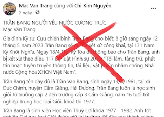 Với những thông tin trên, có thể khẳng định, Trần Bang không phải là người yêu nước chân chính như Mạc Văn Trang tô vẽ, mà là đối tượng chống phá nhà nước.