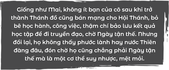 Mai theo Hội Thánh này từ năm 2016, khi đó, mọi thông tin về Hội trên Internet còn rất ít. Đắm mình trong những buổi đi truyền đạo, mặc dù quê chỉ cách chỗ Mai ở chừng 40 km, nhưng khoảng 2 tháng Mai mới về 1 lần, mỗi lần về chỉ có 1 ngày. Vì ở lâu chút, Đấng tiên tri của Mai lại gọi điện giục, họ hạn chế tối đa các “Thánh đồ” tiếp xúc với người thân nếu người thân không có đức tin.