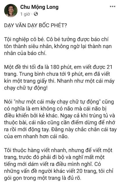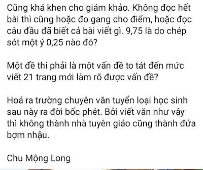 Chu Mộng Long là ai? Nghe qua mình cứ tưởng tên của một nhân vật cải lương nào đó, hoá ra lại là thầy giáo. Đáng buồn là khi gúc cái tên này, lại ra toàn bài tế ông. Thế nên, khi đọc bài của ông viết về nữ sinh thủ khoa đầu vào trường THPT, mình đỡ sốc phần nào.