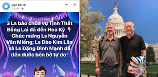 Sáng nay 20/6/2023, tổ chức khủng bố Việt Tân đăng tin: “3 Ls bào chữa vụ Tịnh Thất Bồng Lai đã đến Hoa Kỳ. Chúc mừng Ls Nguyễn Văn Miếng; Ls Đào Kim Lân và Ls Đặng Đình Mạnh đã đến được bến bờ tự do!“. Trong khi đó, RFA lại chỉ có Đặng Đình Mạnh và Nguyễn Văn Miếng trốn thoát, còn Đào Kim Lân đã không thể theo cùng.