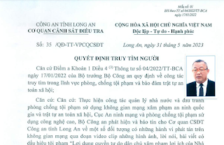 Cơ quan CSĐT Công an tỉnh Long An đã ra quyết định truy tìm các đối tượng nêu trên để phục vụ công tác giải quyết tin báo về tội phạm (có các Quyết định truy tìm người kèm theo).