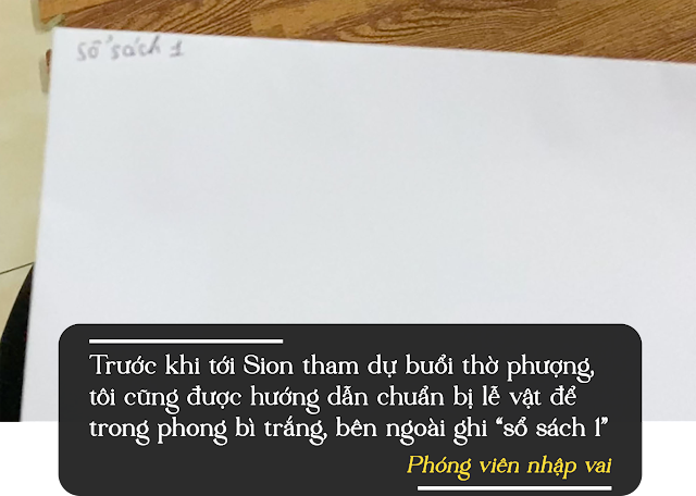 Trong lúc chờ thêm một người tới Sion tham dự buổi lễ, bạn nữ tôi vừa gặp dưới cầu thang hí hoáy chuẩn bị lễ vật và ghi các ký hiệu ra bên ngoài phong bì trắng. Ngày thứ Bảy có 3 khung giờ thờ phượng: sáng bắt đầu từ 9h, chiều 15h và tối 20h, mỗi buổi thờ phượng lại một lễ vật với một mật mã khác nhau.