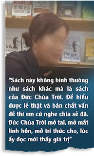 Kinh Thánh khác biệt với tất cả những cuốn sách trên cõi đời này. Nó được coi là cuốn bách khoa toàn thư với hơn 10 lĩnh vực trải dọc từ kinh tế, pháp luật, hội họa, giáo dục… Chỉ từ một cuốn Kinh Thánh, rất nhiều tác giả đã được truyền cảm hứng cho ra đời những cuốn sách khác, đôi khi còn trích dẫn lấy nguồn từ cuốn sách này”, chị Liên nhấn mạnh.