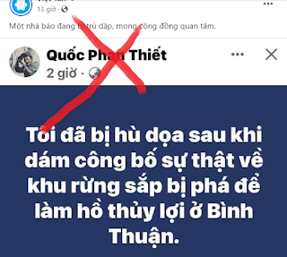 Liên quan tới Dự án hồ chứa nước Ka Pét ở Bình Thuận, suốt từ hôm qua tới giờ, bọn Việt Tân liên tục la lối chuyện “Một nhà báo đang bị trù dập, mong cộng đồng quan tâm”. Trong đó, chúng nhét chữ vào miệng Nhà báo Việt Quốc (Fb Quốc Phan Thiết), rằng “Tôi đã bị hù dọa sau khi dám công bố sự thật về khu rừng sắp bị phá để làm hồ thủy lợi ở Bình Thuận“. Bên cạnh đó, Việt Tân cũng không quên xuyên tạc sự thật về diện tích đất rừng phải nhường chỗ cho hồ thủy lợi Ka Pét này.