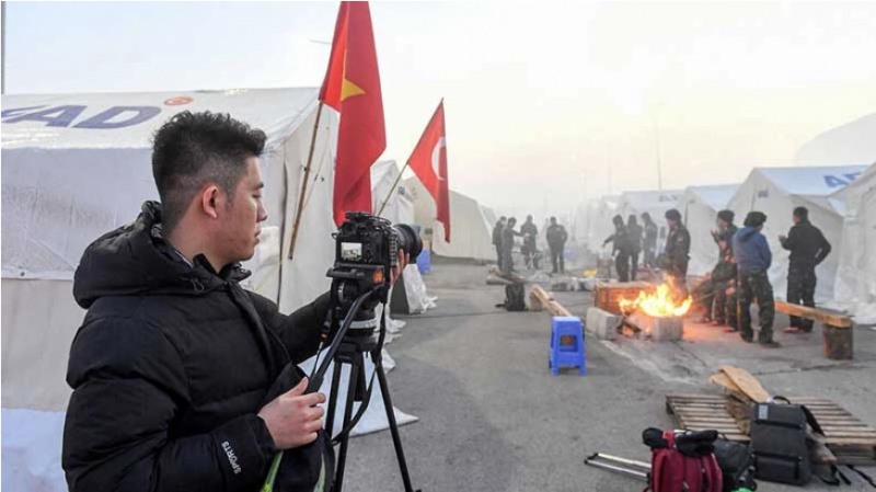 Phóng viên Báo Nhân Dân tác nghiệp tại các vùng chịu ảnh hưởng bởi động đất ở Thổ Nhĩ Kỳ. (Ảnh THÀNH ĐẠT)