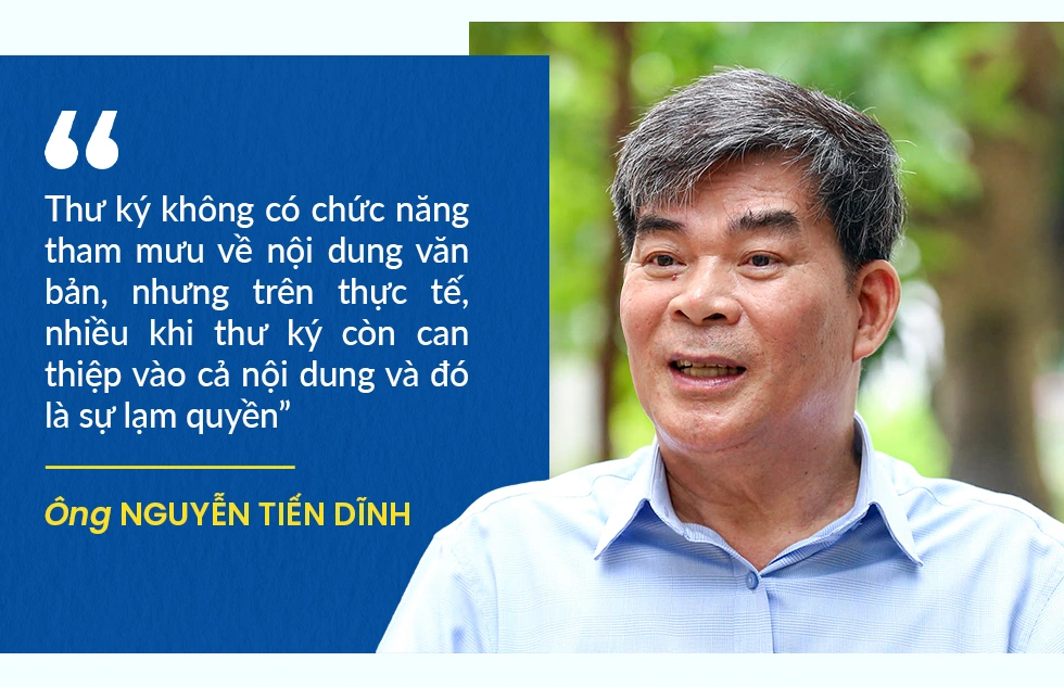 Cùng phân tích về sự can thiệp của thư ký trong quy trình, nguyên Thứ trưởng Bộ Nội vụ Nguyễn Tiến Dĩnh nhấn mạnh, căn cứ vào những quy định hiện hành, thư ký không có chức năng tham mưu về nội dung văn bản (trợ lý được tham mưu) mà chỉ xem xét về hình thức văn bản, trình tự văn bản, thẩm quyền văn bản và nếu thấy đáp ứng được yêu cầu thì mới trình.