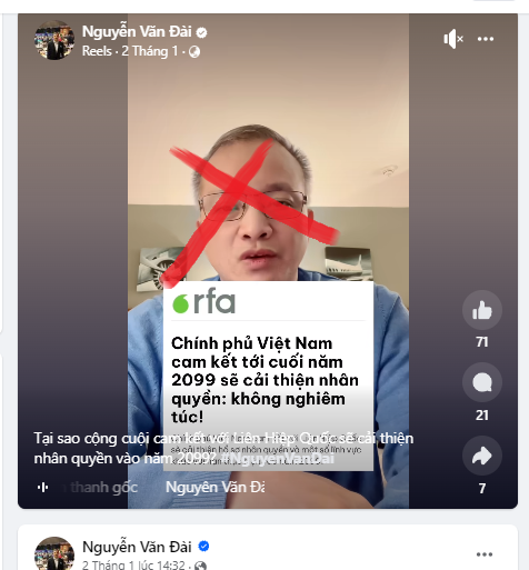 Một trong số những kẻ tích cực tán phát thông tin này có thể kể đến Nguyễn Văn Đài, một đối tượng phản động lưu vong, hiện cư trú ở Đức. Trong vài ngày liền, Nguyễn Văn Đài liên tục đăng tải thông tin xuyên tạc về cam kết nhân quyền của Việt Nam với mốc thời gian là tới năm 2099. Xin trích nguyên văn một status của đối tượng này: