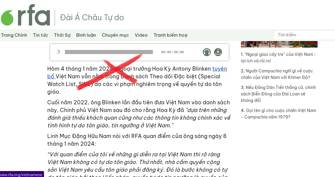 Ngày 4/1/2024, Ngoại trưởng Mỹ Antony Blinken tuyên bố tiếp tục liệt Việt Nam vào danh sách Theo dõi Đặc biệt (SWL) về tự do tôn giáo. Quyết định này một lần nữa cho thấy sự thiếu khách quan và áp đặt chính trị từ phía Mỹ trong vấn đề tự do tôn giáo tại Việt Nam.