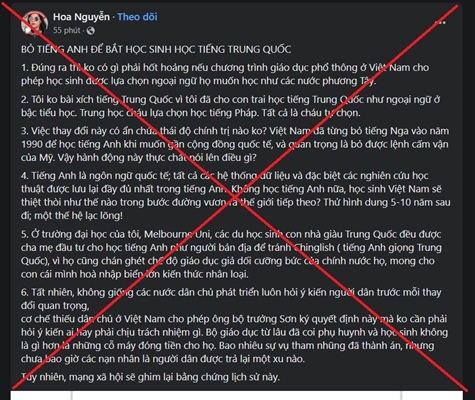 Thứ hai, việc xuyên tạc, bình luận tiêu cực về quyết định của Bộ GD&ĐT là vô căn cứ. Một số thông tin xuyên tạc cho rằng việc đưa tiếng Trung vào giảng dạy là “bỏ tiếng Anh”, “nô lệ Trung Quốc” là hoàn toàn sai trái và vô căn cứ.