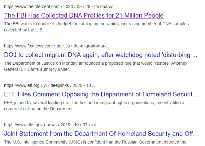 Đến đây có lẽ không cần phải trích dẫn gì thêm và những bài báo, dữ liệu tổng kết tương tự có rất nhiều trên mạng và chỉ cần gõ cụm từ “DNA samples collected by the U.S. Department of Homeland Security” sẽ ra hoàng loạt kết quả như hình dưới: