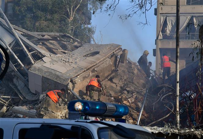 Lực lượng cứu hộ khẩn cấp làm nhiệm vụ tại hiện trường vụ oanh tạc khu vực gần Đại sứ quán Iran ở Damascus, Syria ngày 1/4/2024. Ảnh: AFP/TTXVN