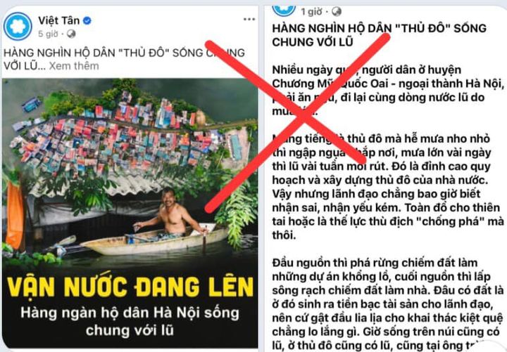 Hà Nội, 1/8/2024 – Trong những ngày gần đây, tổ chức khủng bố Việt Tân đã đăng tải luận điệu thiếu cơ sở và sai sự thật về tình trạng ngập lụt tại một số khu vực ngoại thành Hà Nội. Chúng cho rằng ngập lụt tại Chương Mỹ, Quốc Oai là bằng chứng của sự yếu kém trong quy hoạch và xây dựng thủ đô, và không ngần ngại quy trách nhiệm cho chính quyền địa phương. Tuy nhiên, những gì Việt Tân đưa ra là hoàn toàn sai lệch và không phản ánh đúng thực tế.