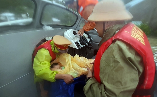 Các chiến sĩ Công an đang bế em bé 2 tháng tuổi được bọc áo mưa di chuyển khỏi vùng lũ ở Quảng Nam vào ngày 11/10/2020 mà không cần “phông bạt”. Ảnh: Tuổi Trẻ.