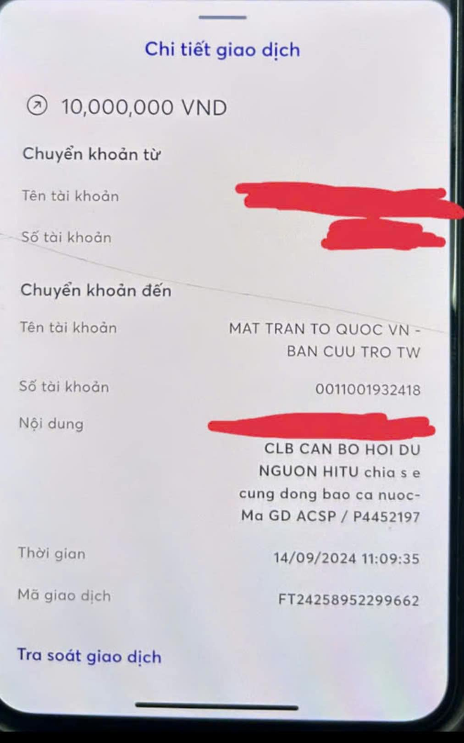 H.T đã khắc phục hậu quả bằng cách chuyển lại 2 lần tiền vào tài khoản của Mặt trận Tổ quốc Việt Nam. Ảnh: NLĐ