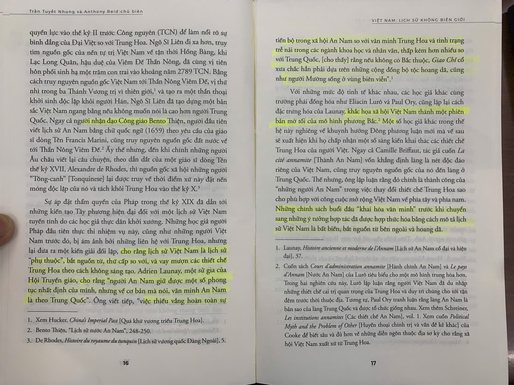 + “Những học giả người Pháp đầu tiên…. đưa ra một kiến giải đối lập, cho rằng lịch sử Việt Nam là lịch sử “phụ thuộc”, bắt nguồn từ thứ cấp so với, và vay mượn các thiết chế Trung Hoa theo cách không sáng tạo. Adrien Launay, một sử gia của Hội Truyền giáo, cho rằng “người An Nam giữ được một số phong tục nhất định của mình, nhưng về cơ bản mà nói, văn minh An Nam là theo Trung Quốc” (tr. 16). Ông viết tiếp “việc thiếu vắng hoàn toàn sự tiến bộ trong xã hội An Nam so với văn minh Trung Hoa và tình trạng trể nải trong các ngành khoa học và nhân văn, thấp kém hơn nhiều so với Trung Quốc, [cho thấy] rằng nếu không có Bắc Thuộc, Giao Chỉ cổ xưa chắc hẳn phải dựa trên những cộng đồng bộ tộc hoang dã, cũng như người Mường sống ở vùng biên viễn” (tr. 17).
