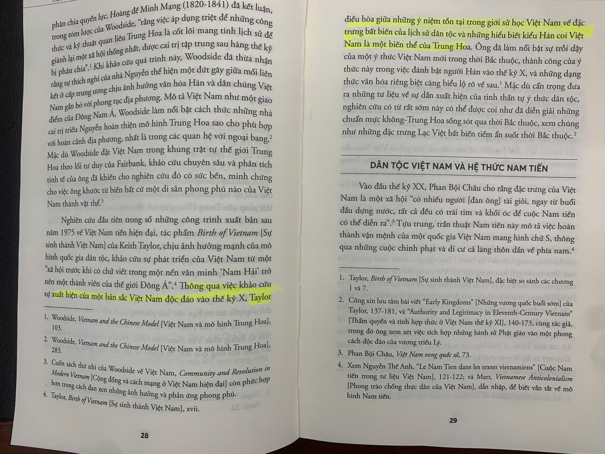 Trang 28, 29 nội dung ghi: “Thông qua việc khảo cứu sự xuất hiện của một bản sắc Việt Nam độc đáo vào thế kỷ X, Taylor điều hòa giữa những ý niệm tồn tại trong giới sử học Việt Nam về đặc trưng bất biến của lịch sử dân tộc và những hiểu biết kiểu Hán coi Việt Nam là một biến thể của Trung Hoa”.