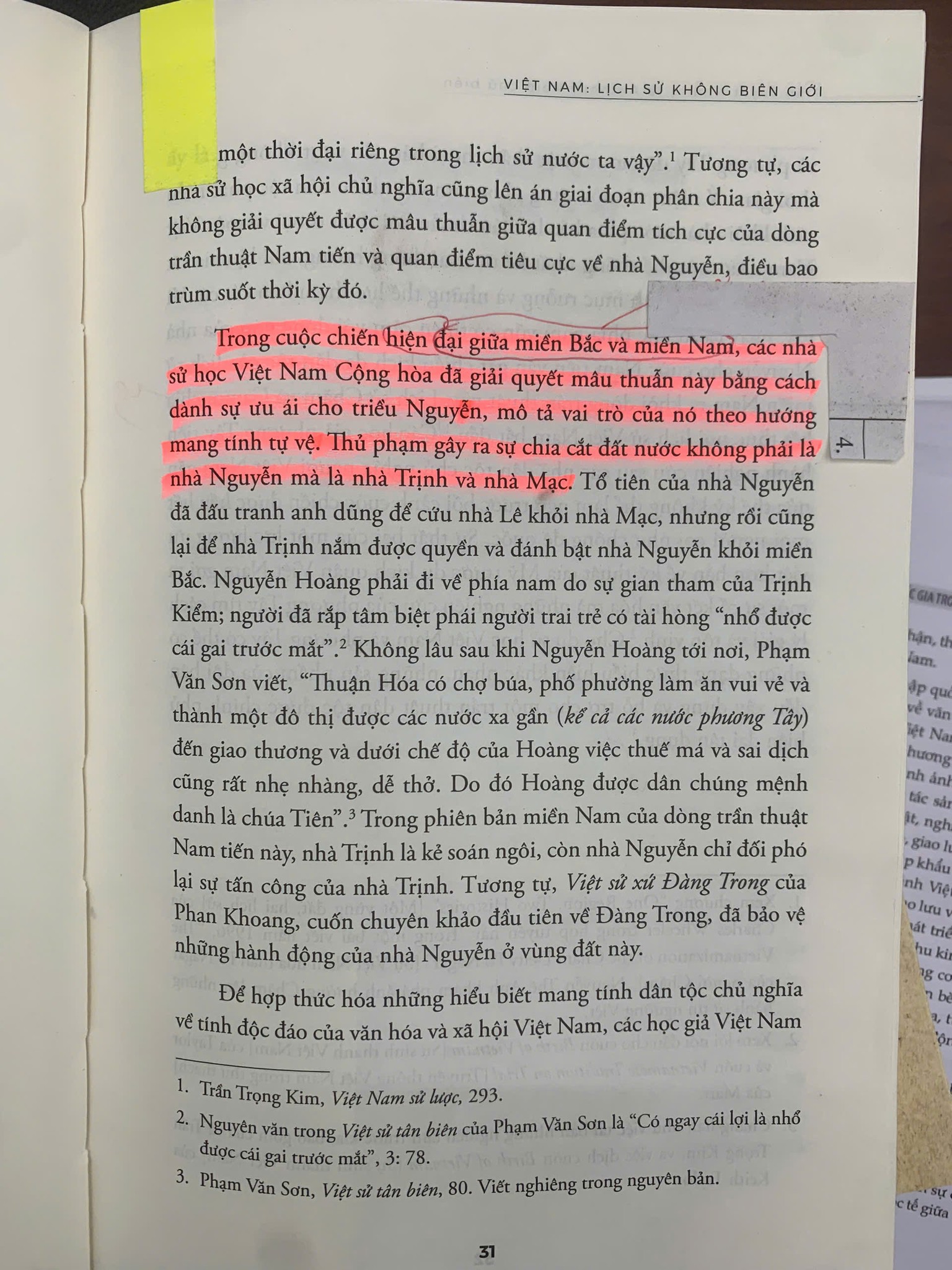Trang 31 nội dung ghi: “Trong cuộc chiến hiện đại giữa miền Bắc và miền Nam, các nhà sử học Việt Nam Cộng hòa đã giải quyết mâu thuẫn này bằng cách dành sự ưu ái cho triều Nguyễn, mô tả vai trò của nó theo hướng mang tính tự vệ. Thủ phạm gây ra sư chia cắt đất nước không phải là nhà Nguyễn mà là nhà Trịnh và nhà Mạc”.