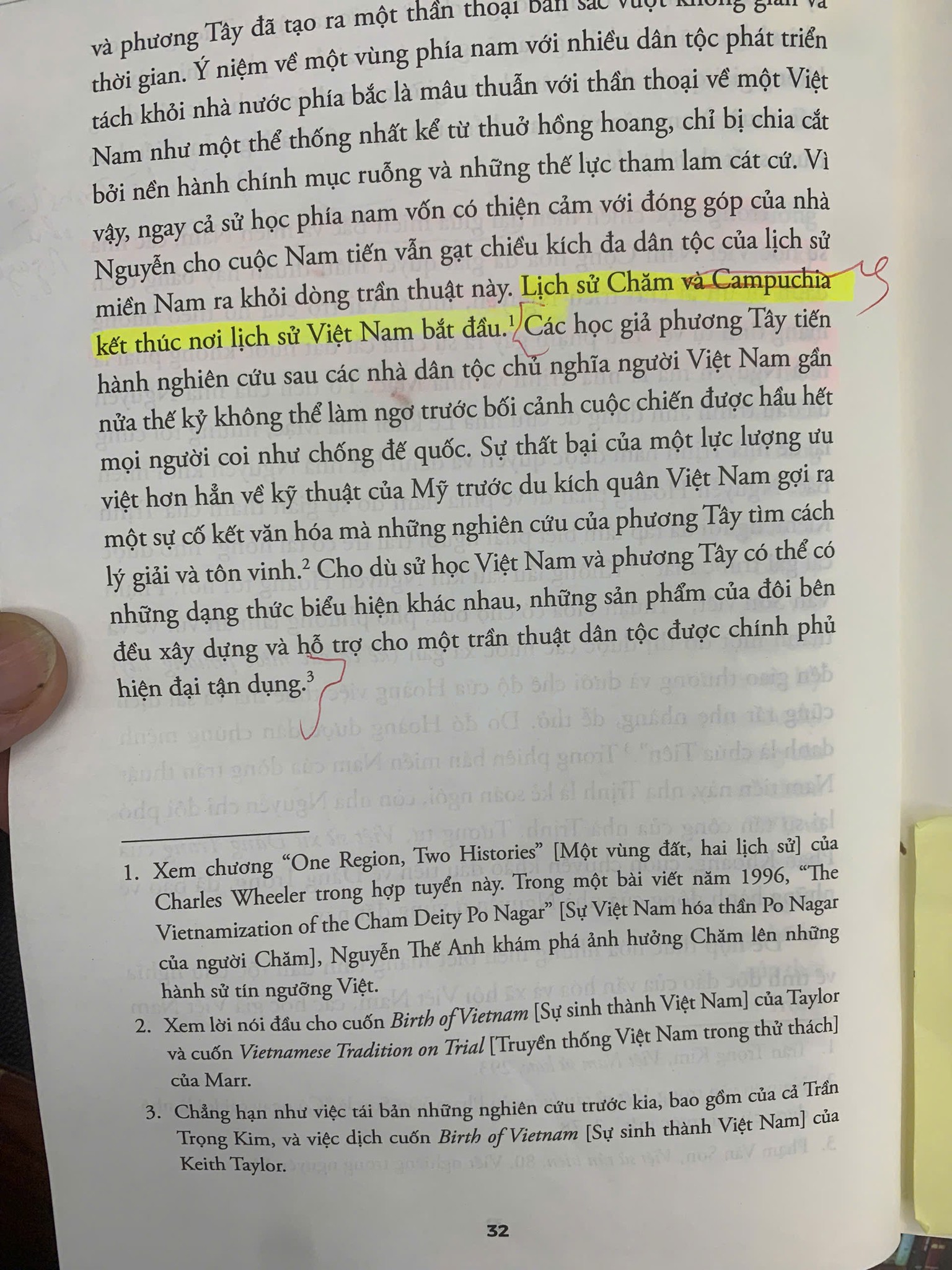 Trang 32 nội dung ghi: “Lịch sử Chăm và Campuchia kết thúc nơi lịch sử Việt Nam bắt đầu”.
