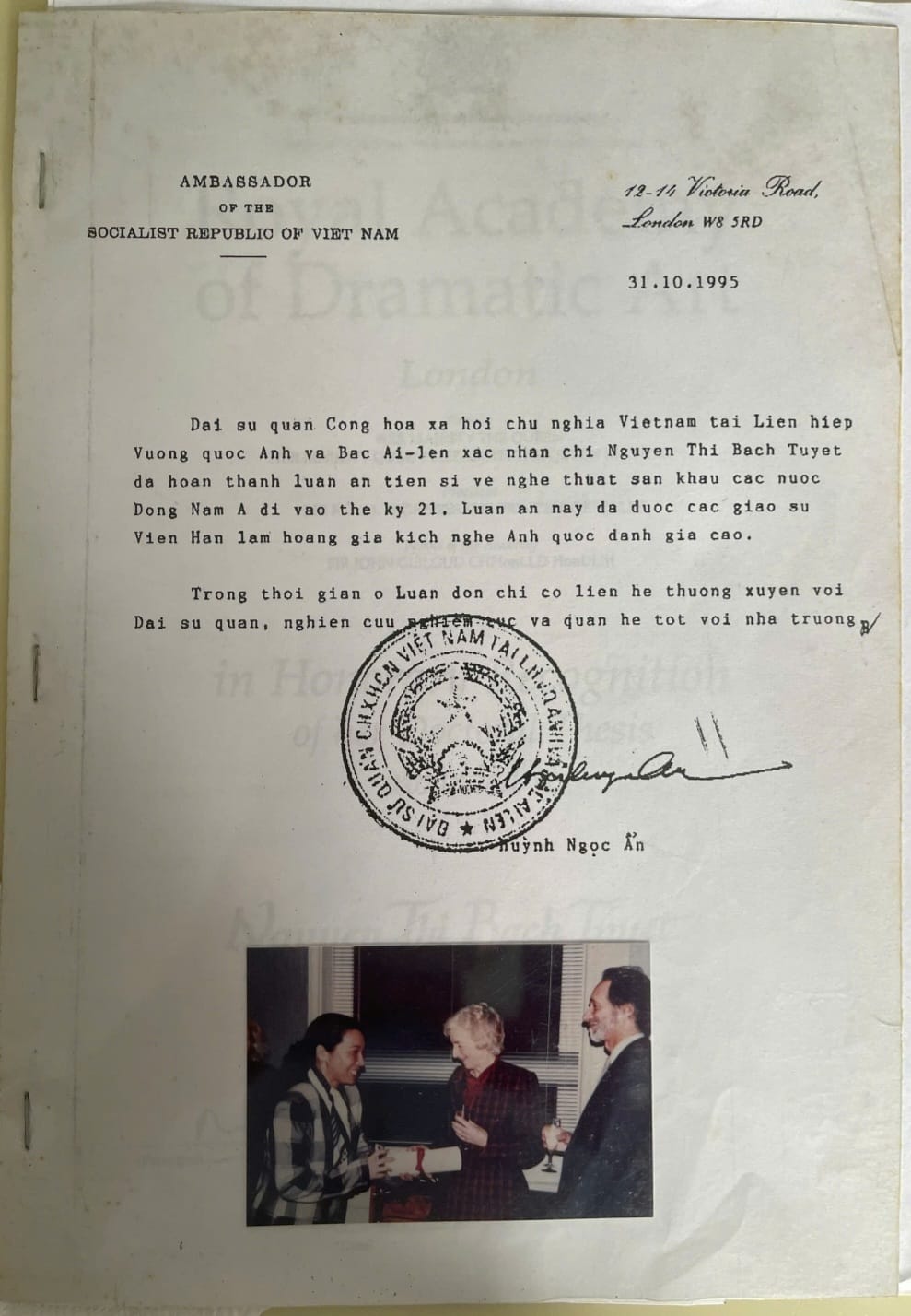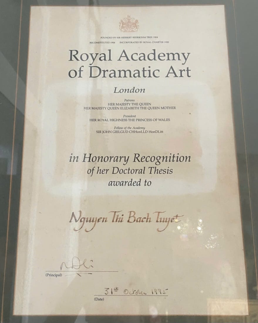 Đáng chú ý, trong giai đoạn 1991-1995, NSND Bạch Tuyết còn tham gia một số khóa học tại Royal Academy of Dramatic Art (RADA) ở Anh, nơi bà hoàn thành 10 môn học với tổng cộng 124 tín chỉ. Mặc dù RADA không có chức năng cấp bằng tiến sĩ, họ đã cấp giấy chứng nhận “Honorary Recognition” để ghi nhận thành tích luận án của bà.