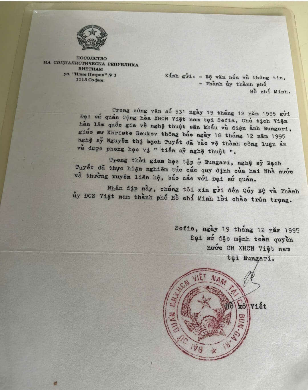 Theo một bài viết được NSND Bạch Tuyết dẫn lại từ tác giả Nam Phan, bà từng là nghiên cứu sinh tại Học viện Nghệ thuật Sân khấu và Điện ảnh Quốc gia Bulgaria (NATFA). Sau khi hoàn thành luận án tiến sĩ vào năm 1996, bà được Ủy ban Chứng thực Trung ương của Bulgaria (HAC) cấp bằng với mã số 24348.