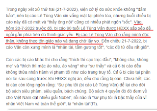 Trích báo Công an TP HCM: “Trong ngày xét xử thứ hai 21/7/2022, viện cớ lý do sức khỏe không “đảm bảo”, nên bị cáo Lê Tùng Vân xin vắng mặt tại phiên tòa, nhưng buổi chiều bị cáo này đã có mặt và “thầy ông nội” cũng có nhiều phát ngôn “sốc”. Vào hôm 20/7/2022 trước đó, bị cáo 90 tuổi Lê Tùng Vân được HĐXX sắp xếp để ngồi gần phía trên do thính giác yếu. Bị cáo Lê Tùng Vân cho rằng mình độc thân, không theo tôn giáo nào và đang chờ lấy vợ”.