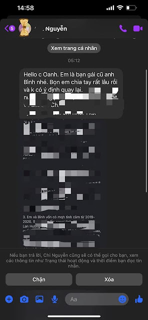 Dưới đây là tin nhắn bạn gái cũ anh ấy gửi cho Oanh mấy ngày trước (ảnh phía dưới), lý do gửi thì chuyện không liên quan nên Oanh không chia sẻ. Tức là trước khi đến với Oanh, anh Bình cũng đã yêu một số người nhưng lúc đó chị ta lại KHÔNG hề “thượng tôn pháp luật” hay tỏ ra “đau buồn trách giận”. Thậm chí gần đây còn động viên anh ấy cứ thoải mái yêu đi (ảnh phía dưới) để được chăm sóc và mỗi người có cuộc sống riêng, nghe thật cao thượng !!!