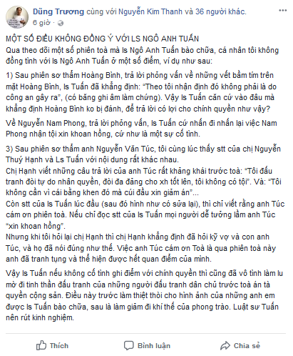Loa Phường   Ngày 22 tháng 4 năm 2018, trên trang Facebook cá nhân, nhà chống Cộng Nguyễn Tường Thụy mở một cuộc đấu tố luật sư Ngô Anh Tuấn. Theo lời ông Thụy, thì có người khẳng định rằng luật sư Ngô Anh Tuấn đã khuyên thân chủ của mình, là Nguyễn Viết Dũng, [...]