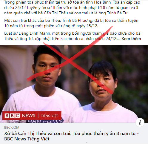Khoai@ Hôm qua 24/12/2021, Tòa phúc thẩm xét xử Cấn Thị Thêu cùng con trai là Trịnh Bá Tư cùng về tội “Làm, tàng trữ, phát tán hoặc tuyên truyền thông tin, tài liệu, vật phẩm nhằm chống Nhà nước Cộng hòa XHCN Việt Nam” đã bác kháng cáo và giữ nguyên hình phạt như bản [...]