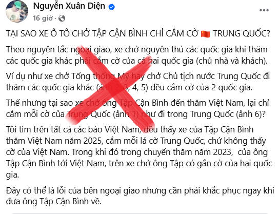 Lâm Trực@ Trong chuyến thăm cấp nhà nước của Tổng Bí thư, Chủ tịch nước Trung Quốc Tập Cận Bình tới Việt Nam ngày 14/4/2025, một số ý kiến trên mạng xã hội, nổi bật là bài viết của Nguyễn Xuân Diện, đã thổi phồng việc xe đưa đón ông chỉ cắm một lá cờ [...]